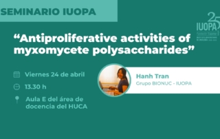Viernes 24 de abril de 2026 | 13:30h Ponente: Hanh Tran Grupo de Investigación: BIONUC Título: “Antiproliferative activities of myxomycete polysaccharides” Lugar: Aula E del área docente del HUCA