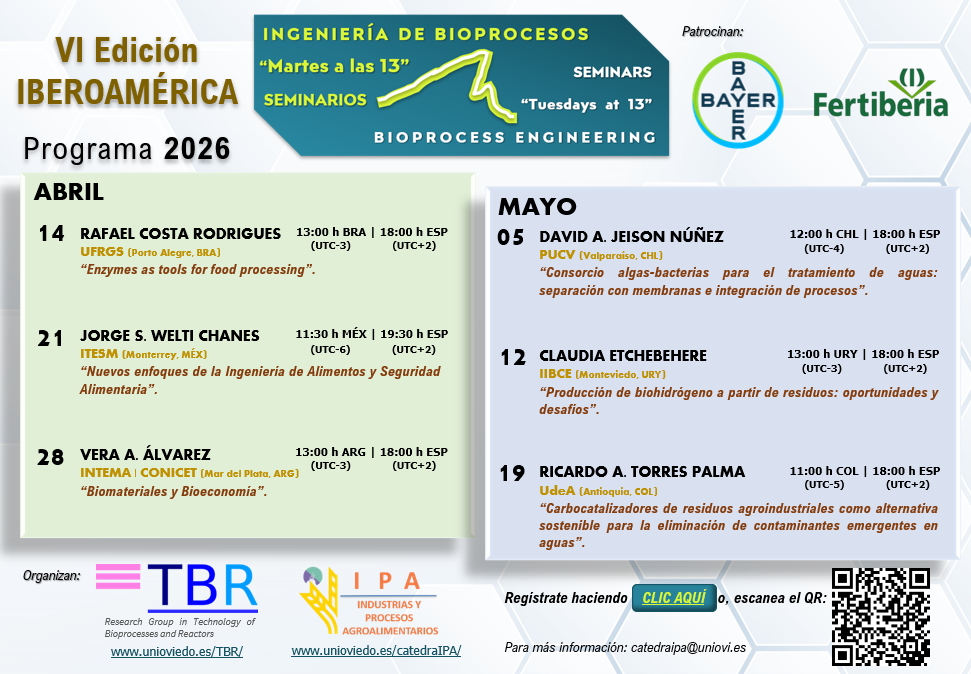This seminars, organized by the TBR research group and the Chair of Industries and Food Processes of the University of Oviedo, in an informal setting, will be wide open to diverse topics of bioprocess engineering, including the food, biological, and environmental fields and related fields of chemical engineering. They will be aimed at doctoral students and researchers of different levels. You can check the previous editions HERE.