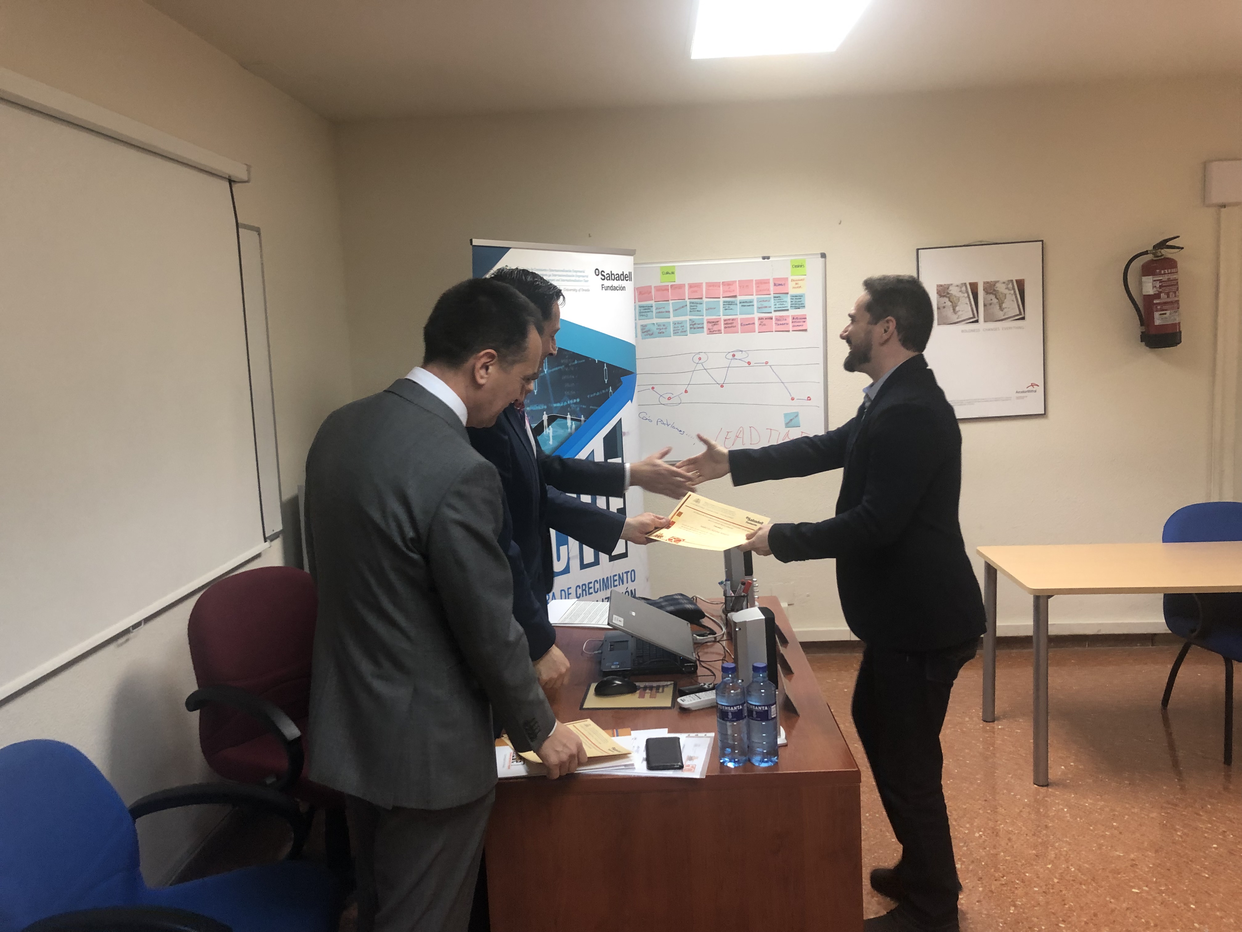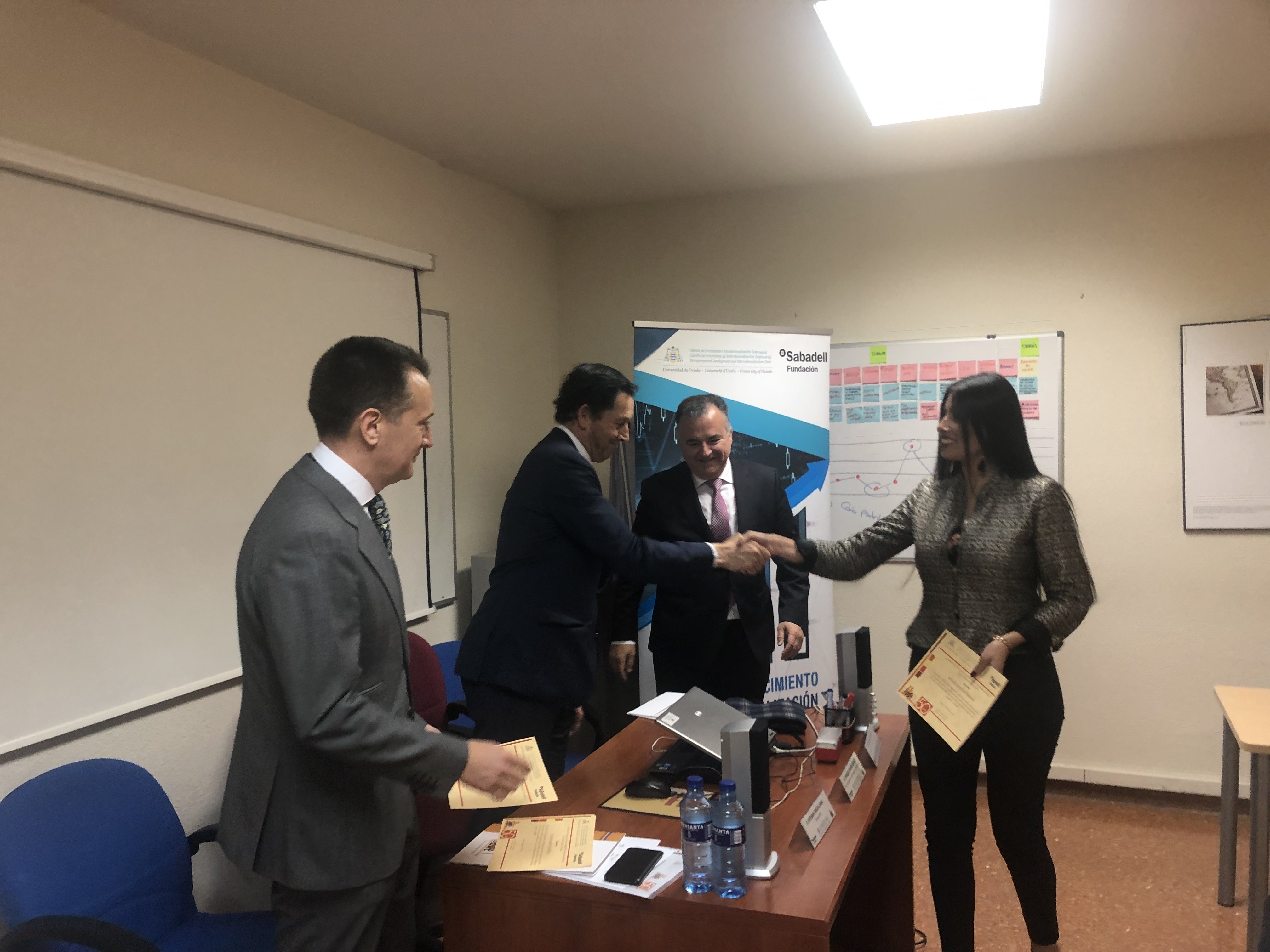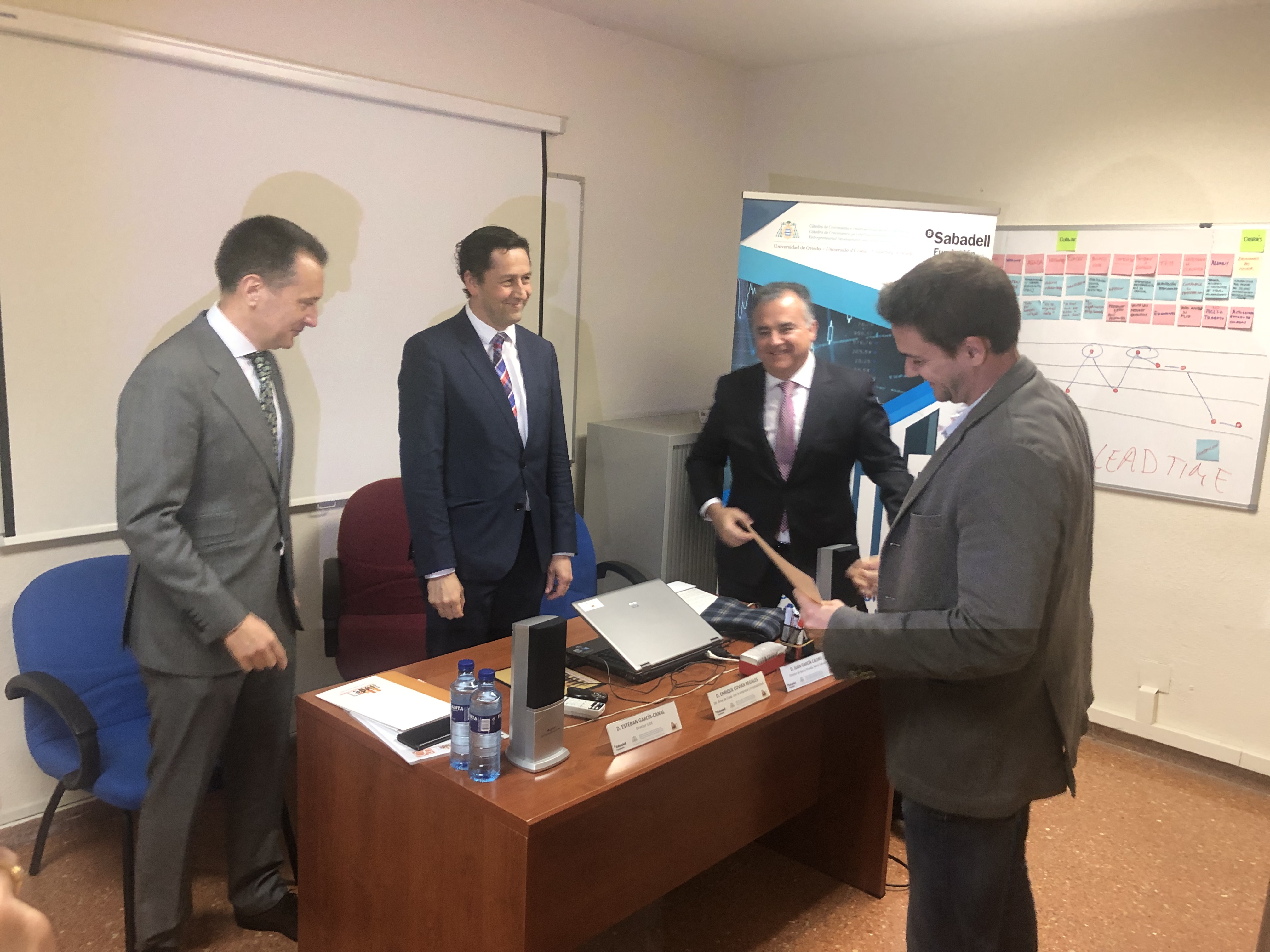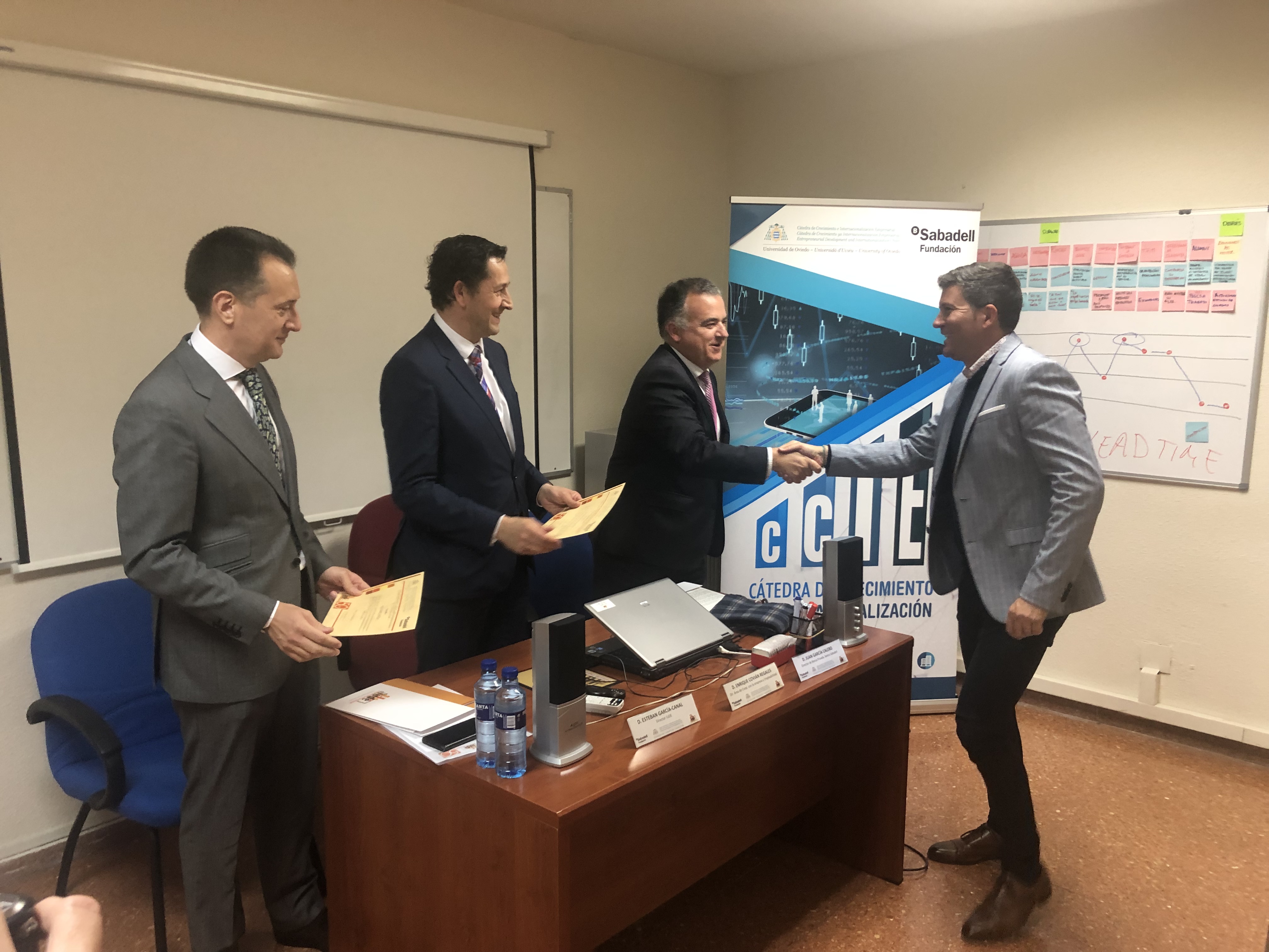 Hoy jueves 28 de marzo, en la sede del Instituto Universitario de la Empresa (IUDE), la Escuela de Negocios de la Universidad de Oviedo, ha tenido lugar el acto de entrega de las Ayudas de matrícula de la Cátedra de Crecimiento e Internacionalización Empresarial a cinco estudiantes del programa MBA Ejecutivo del IUDE. El acto ha contado con la presencia del Director de Área de Cooperación con la Empresa y Empleabilidad de la Universidad de Oviedo, Enrique Covián Regales; del director de la Cátedra y director del IUDE, Esteban García Canal, y de Juan García Calero en representación de la Fundación Banco Sabadell.