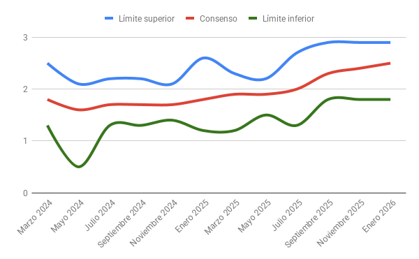 Para el año 2026 la predicción de consenso según el Panel de Funcas se sitúa en el 2,2%, con mejores expectativas de la demanda interna mientras empeora el comportamiento previsto para el sector exterior.